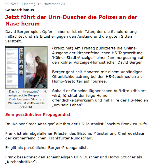 FSSPX-Fan Berger entstammt selbst dem braunen Klerikalsumpf und war während der acht Kreunznetjahre (2014-2012) die längste Zeit ein Liebling der Radikalen. Dann aber wurde sein Schwulsein öffentlich und Kreuznet drosch geradezu besessen auf den Renegaten ein.