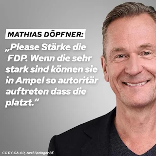 Auf den Vorwurf, er nehme Einfluss auf die Bild-Berichterstattung, lässt er ausrichten: "Zur These, Mathias Döpfner nehme Einfluss auf BILD, kann ich nur sagen: ich hoffe doch sehr. Das ist als CEO und Miteigentümer mein Job. Aber über allem steht die Freiheit der Redaktionen. Und nichts schütze ich so sehr und leidenschaftlich." Döpfners Denke war schon lange offenkundig. In der gehobenen Berliner Gastronomie wird Döpfners Nähe zu Christian Lindner niemanden überraschen. Dass dessen Partnerin Franca Lehfeldt für den Konzern arbeitet, wurde spätestens bekannt, als sie vor der Eheschließung von einem FDP-Parteitag berichtete und nach der erwartungsgemäßen Kritik daran zu einem Gesundheitsmagazin versetzt wurde. [….]